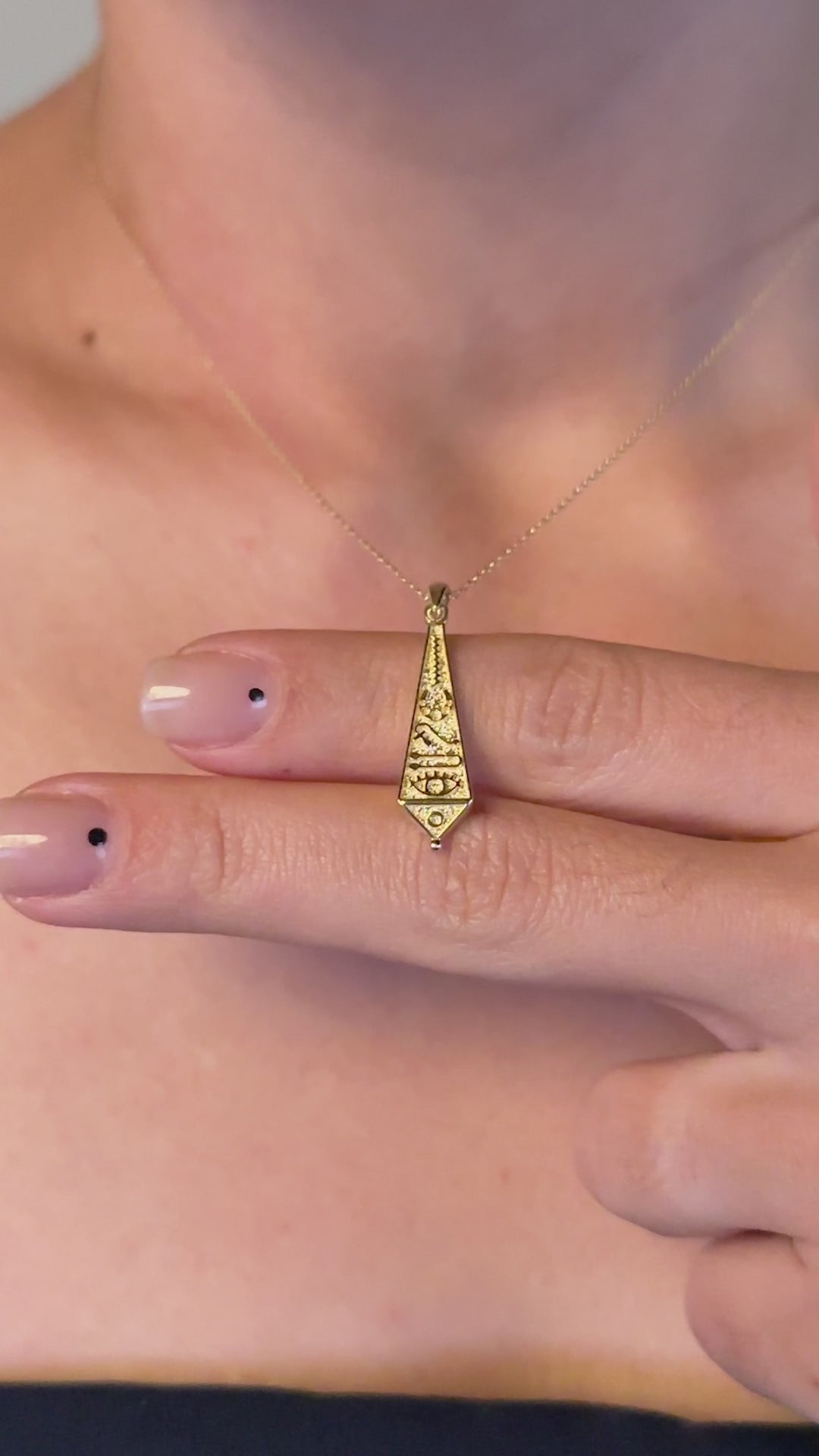 Dokulu yüzeyi ve ince işçilikle hazırlanmış semboller, altının sıcak ışıltısıyla birleşerek kolyeye vintage ve özgün bir görünüm kazandırır. Uzun ve dengeli formu sayesinde boyunda zarif bir odak noktası oluştururken minimal zinciri tasarımın ön plana çıkmasını sağlar.